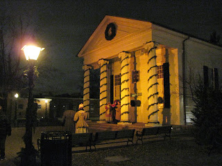 Tonight the three of us went down to Holiday Nights at Greenfield Village. The chill in the air meant that we had to bundle up tight, but unlike the last time we went, tonight we had dry skies and calm winds, so it was bearable. Lots of people turned out to take in the caroling, lights, wagon rides, and other activities.
